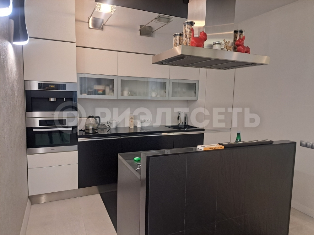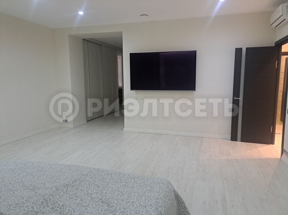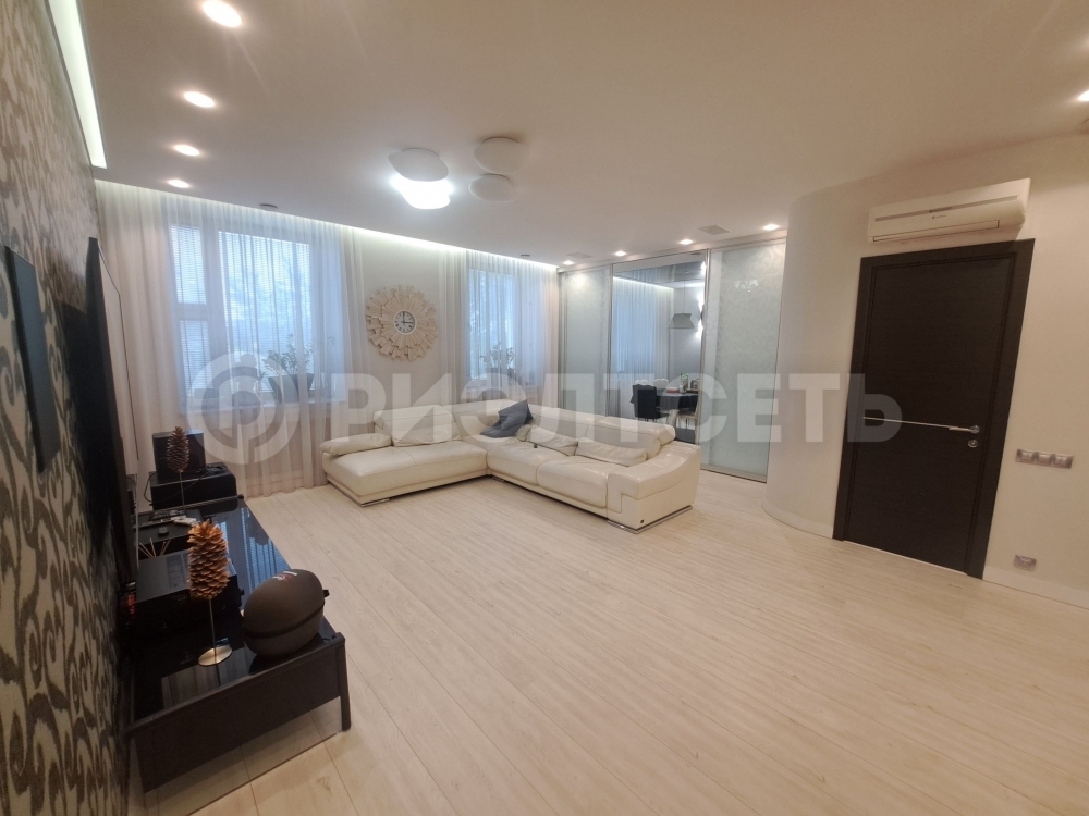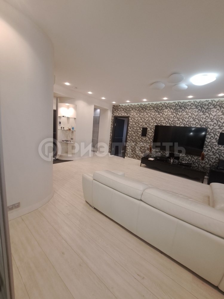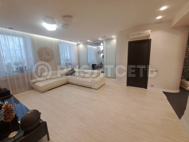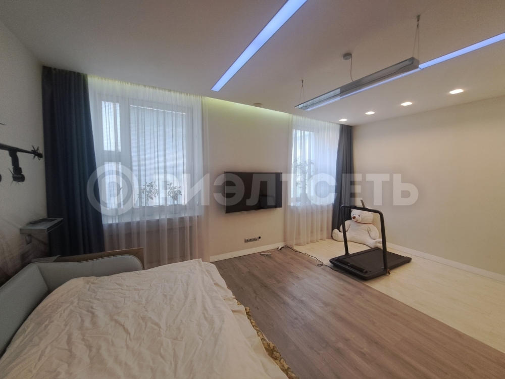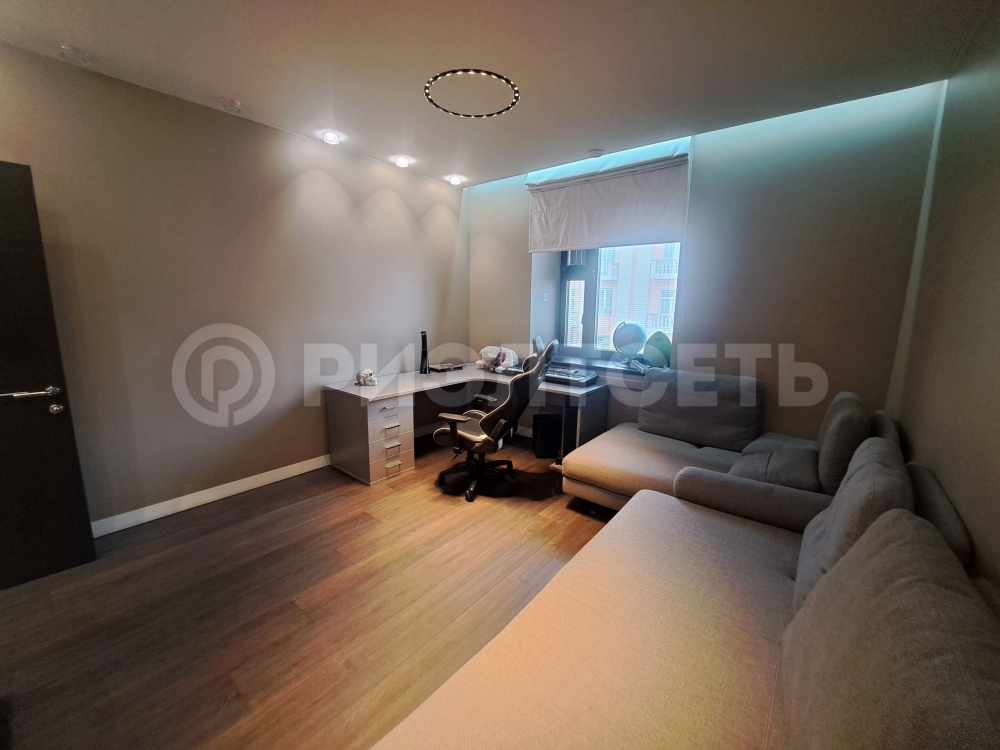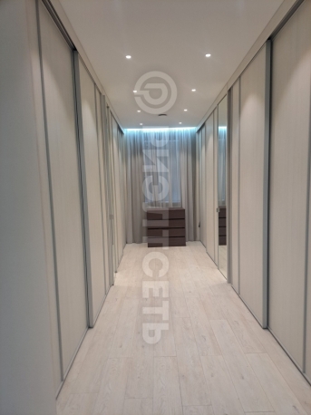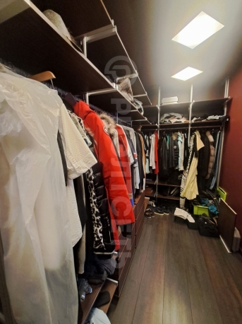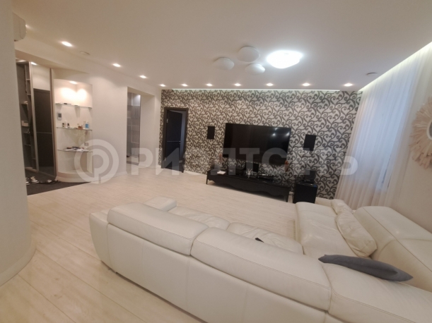 В квартире: кухня-гостинная, просторная спальня, две детские комнаты, две гардеробные и два сан. узла, хоз. помещение.