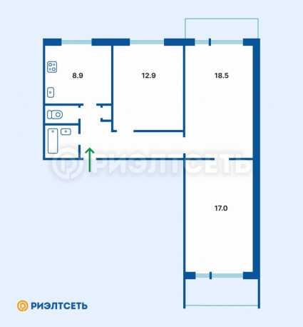 Трёхкомнатная квартира улучшенной планировки с балконом и лоджией.
