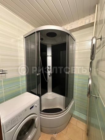 В ванной кафель, душевая кабина.