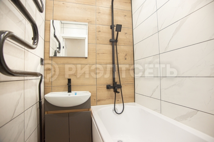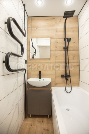 Ванная комната отделана керамогранитом, создающим ощущение простора и чистоты. Смесители имеют гарантию пять лет, гарантируя их долговечность и качество. Вся сантехника подобрана с особым вниманием к деталям, подчеркивая общий дизайн помещения.