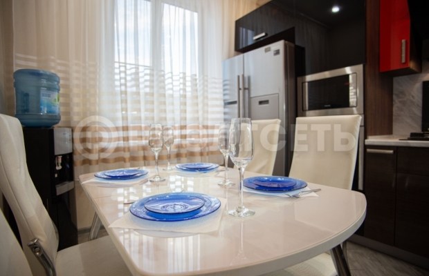 В просторной кухне 10.1м2, где помещается функциональный кухонный гарнитур, большой двухдверный холодильник, посудомоечная машина, микроволновая печь, духовой шкаф, кофе-машина, вытяжка, большой стол, телевизор, можно спокойно проводить домашние праздники.